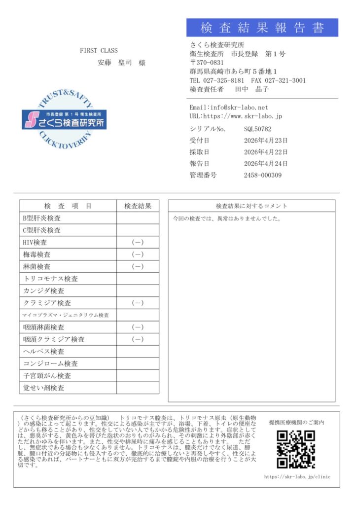 FIRST CLASSではホテルコースをお受けするキャストは約ひと月に1回性病検査を行なっております。