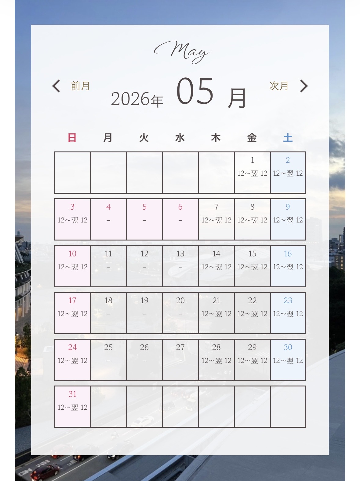 来月のスケジュールを更新いたしました。金曜と土曜にそれぞれ枠を追加していますが、基本的には「木・金どちらか」「土・日どちらか」という形で認識していただければ幸いです。※例外はステイパックなど