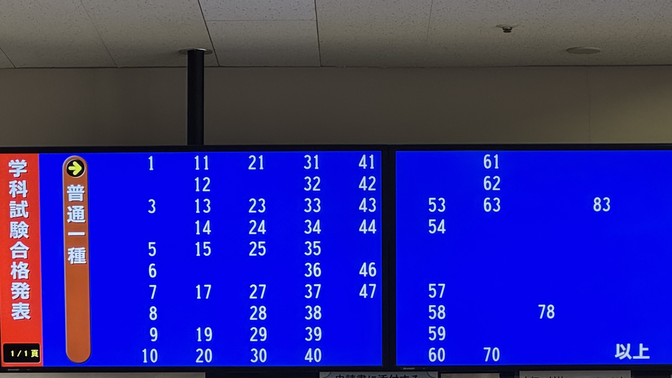 ロビーに待機していた受験者が電光掲示板の前に続々と集う。不合格者は発表後すぐに試験室へ戻らないといけないらしい。それはかなり恥ずかしい……。確信歩きなんかしなきゃよかった。受験番号は30番。祈る。