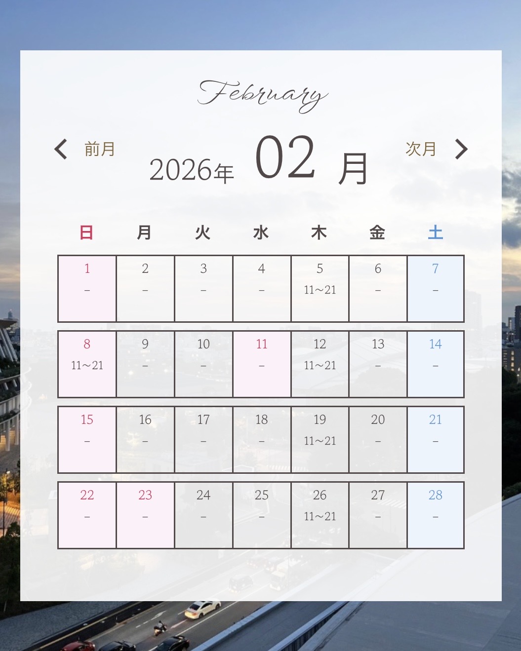 なるべく早めにと思いまして、来月のスケジュールを更新しました。リクエスト出勤も承っておりますので、記載の日時以外であってもお気軽にご相談いただけますと幸いです。お問い合わせお待ちしております。