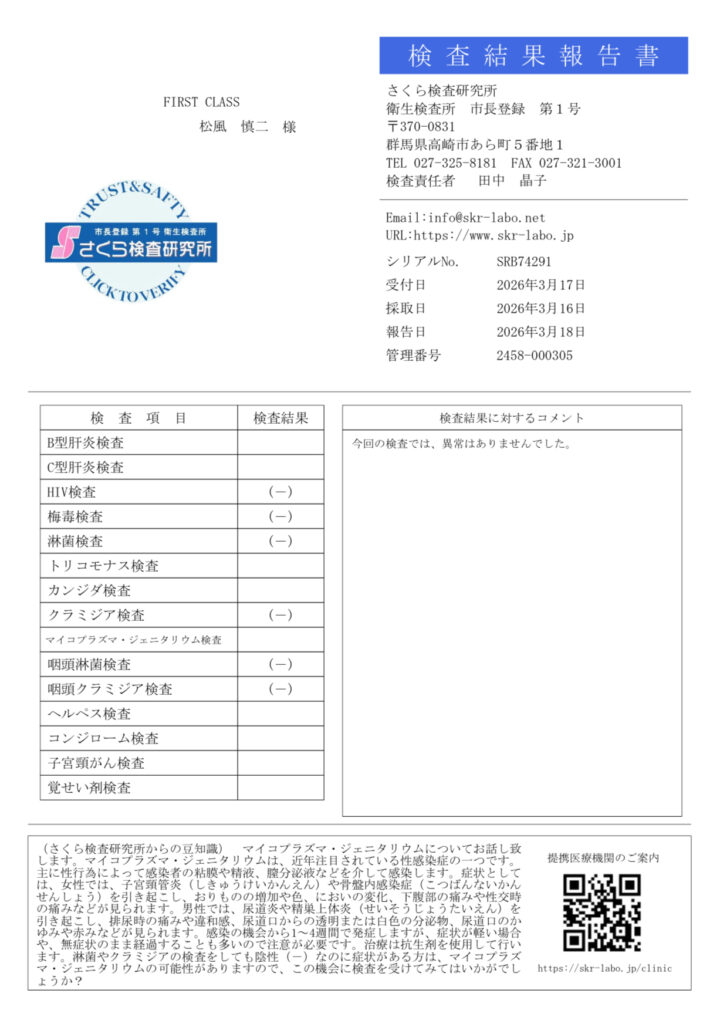 FIRST CLASSではホテルコースをお受けするキャストは約ひと月に1回性病検査を行なっております。