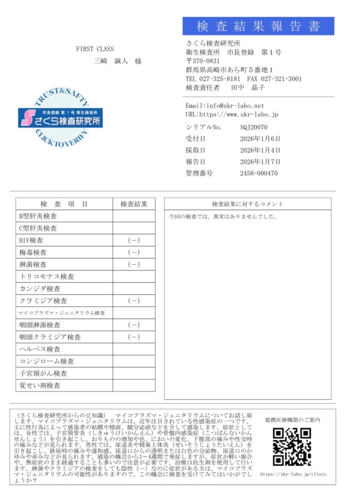 FIRST CLASSではホテルコースをお受けするキャストは約ひと月に1回性病検査を行なっております。