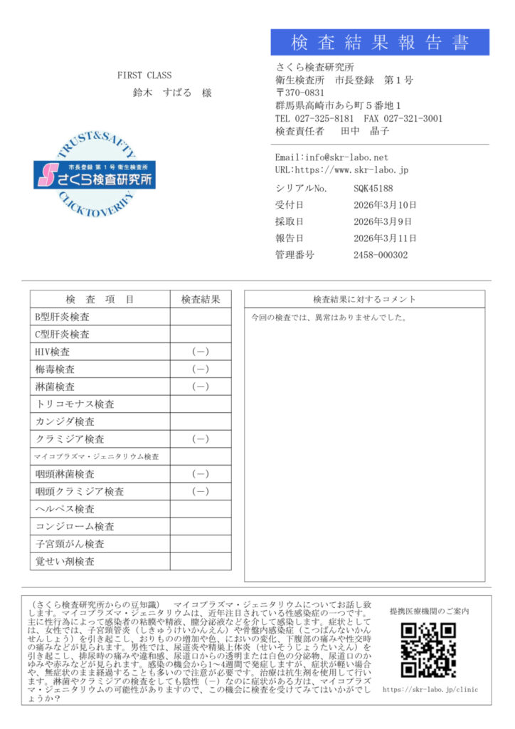 FIRST CLASSではホテルコースをお受けするキャストは約ひと月に1回性病検査を行なっております。